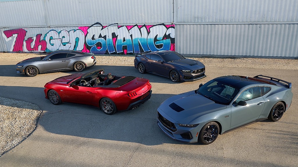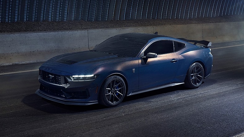 The updated Mustang comes standard with a 315 hp EcoBost turbocharged four-cylinder engine, but the Mustang GT gets a 480 hp 5.0-liter V8, while the Mustang Dark Horse is powered by a 500 hp 5.0-liter V8.
