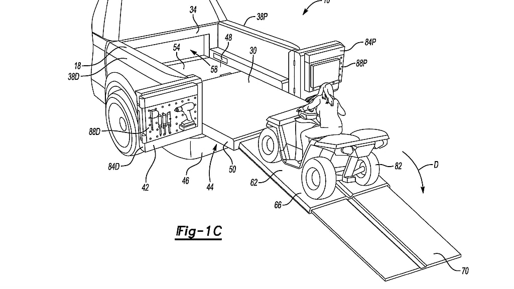 One is for storage and power outlet access compartments with drop down doors built into its outsides, like what you might find on an aftermarket service body. Rivian filed for a patent on a similar feature this spring. Ford’s other ideas are more of a … stretch.
