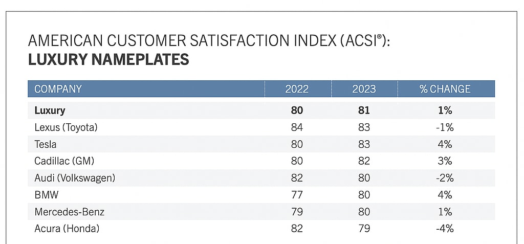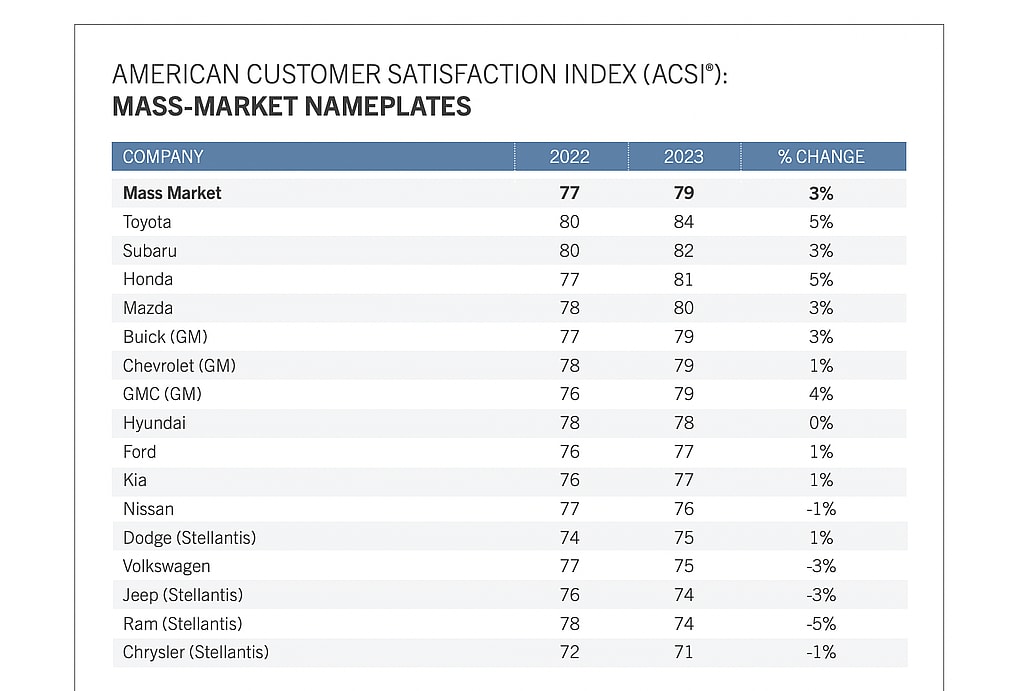 Toyota and Lexus have swept the top spots on the 2023 American Customer Satisfaction Index among mainstream and luxury brands, but not exclusively.
