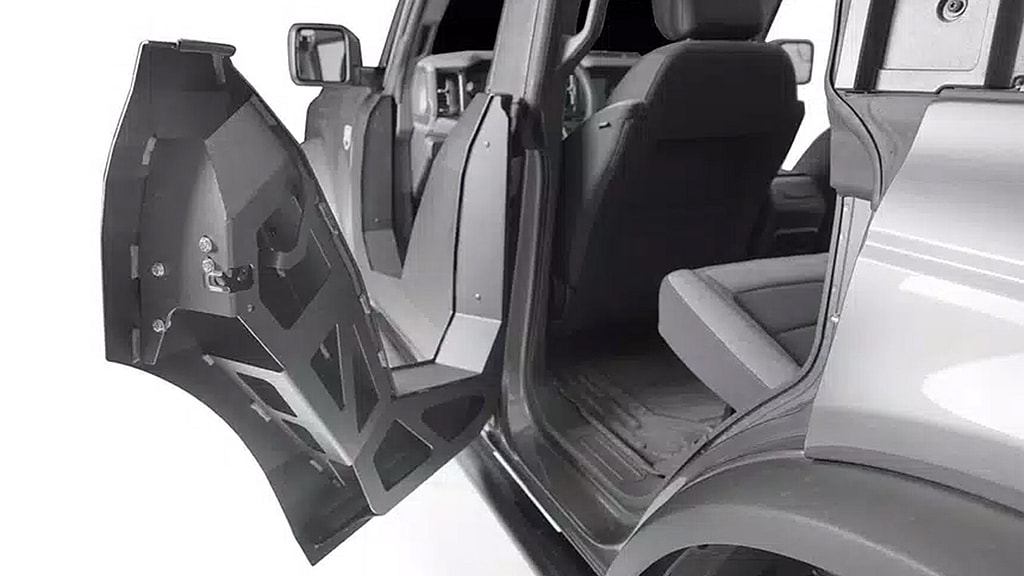 The Ford Bronco has easily removable full doors that can be replaced by the hinged tube doors, which provide some side intrusion protection while creating more of an open-air experience.