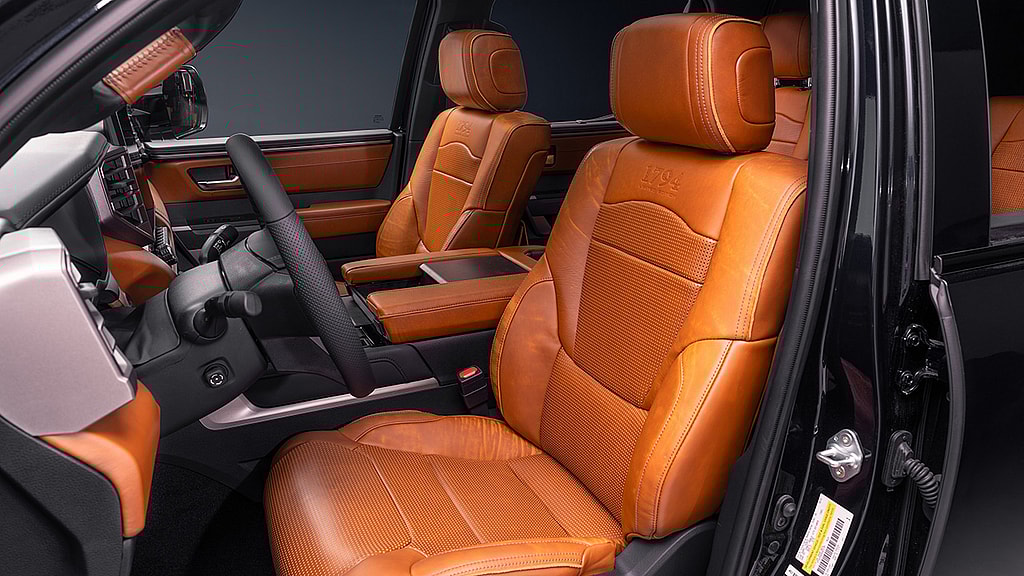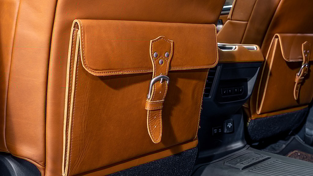 The truck’s high-end leather upholstery was designed through a partnership with the Saddleback Leather Company.