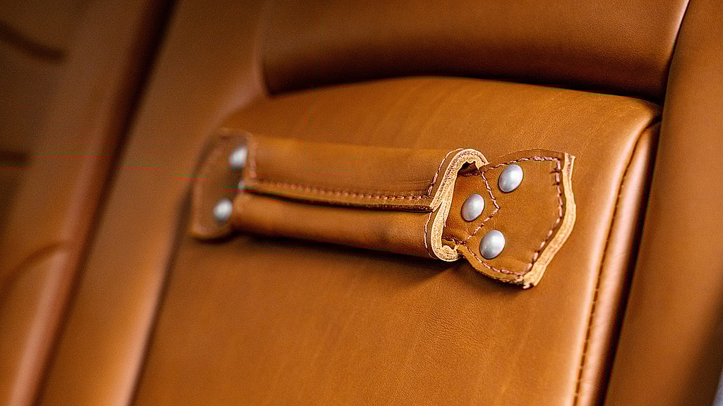 The seatback pockets also resemble saddle bags with a belt closure and there’s a bag-handle for the rear center armrest.