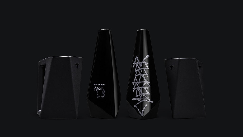 The two 11.2-ounce bottles of 7% ABV brew comes in bottles with gloss black sleeves and is paired with a set of two ceramic CyberSteins with an angular design inspired by the Cybertruck.