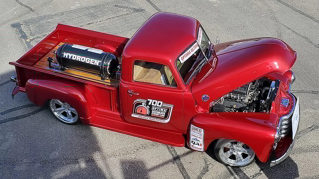It’s also converted a GM 6.2-liter V8 to run on the fuel and used it to power a 1948 Chevrolet pickup it built with the hydrogen tank proudly displayed in the bed.