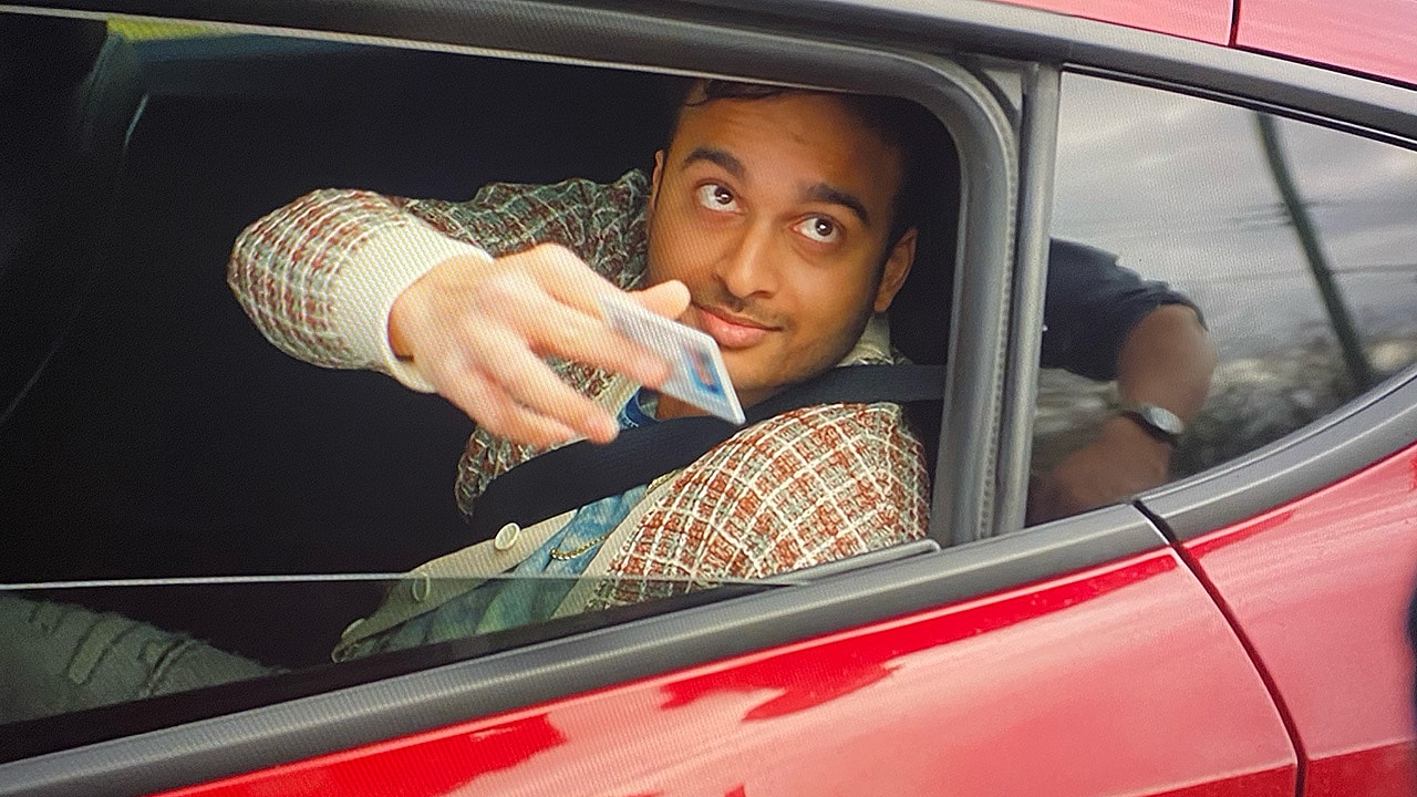 Shaw, played by Joel McHale was on patrol with his partner Shred, portrayed by Michael Rowland, when a red Model Y pulled up to their truck at a stop light, then drove away when the light turned green.