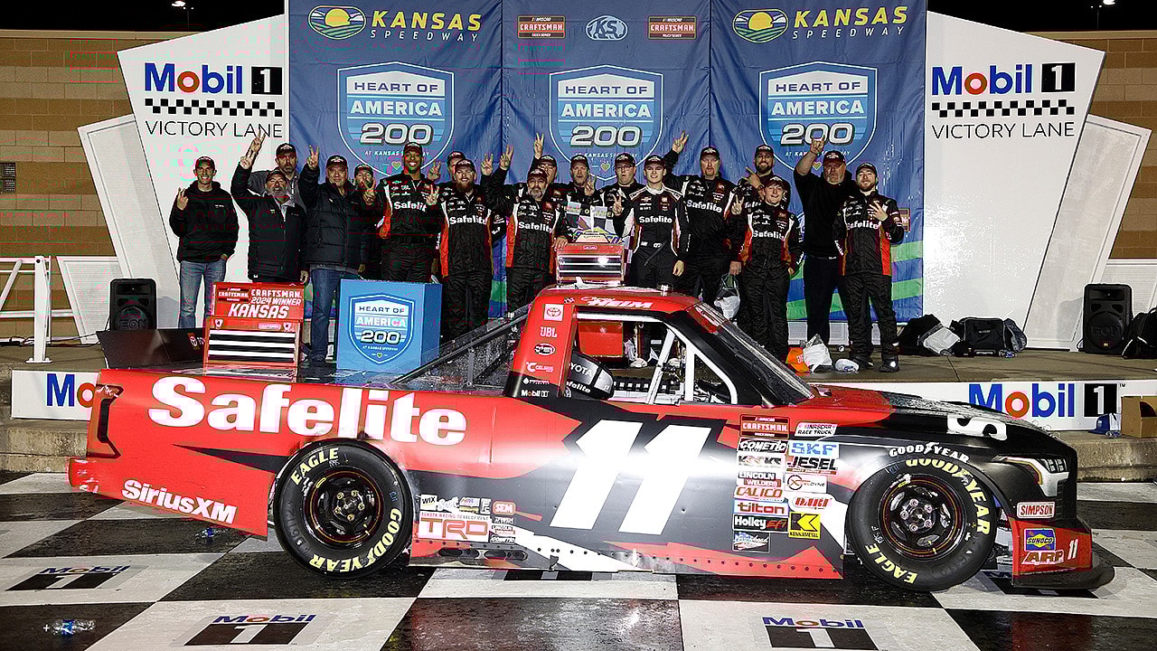 Corey Heim took control of Saturday night’s Heart of America 200 in the final stage and charged to his second NASCAR Craftsman Truck Series victory of the season, despite fighting a loose handling condition in the closing stages.