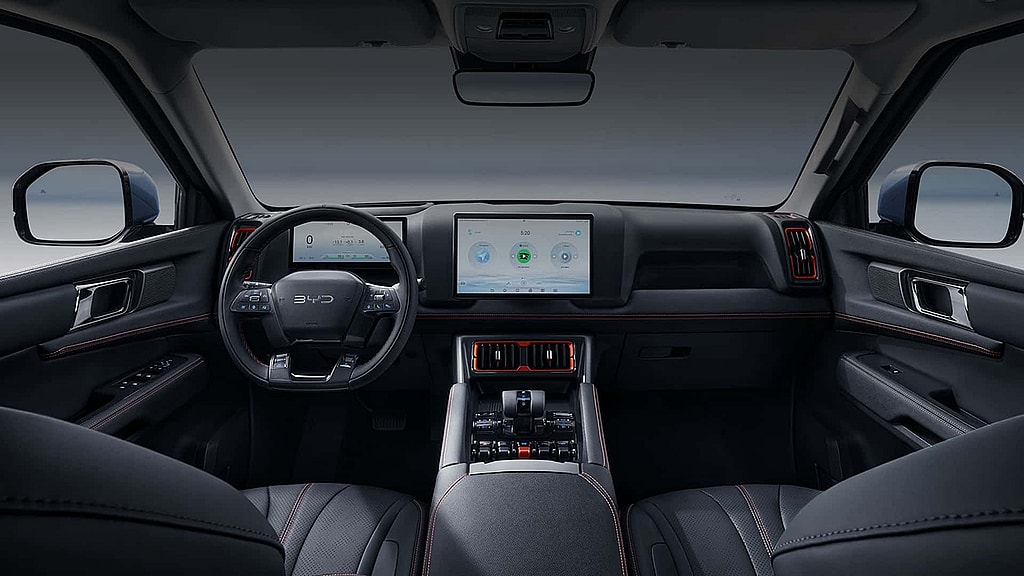 The Shark’s exterior styling is similar to the Ford F-150 Lightning’s, with light bars wrapping both ends, while the interior has a digital instrument cluster and a touchscreen infotainment system display that can be rotated 90 degrees between landscape and portrait orientations. A transmission selector level and chunky toggle switches dominate the center console.