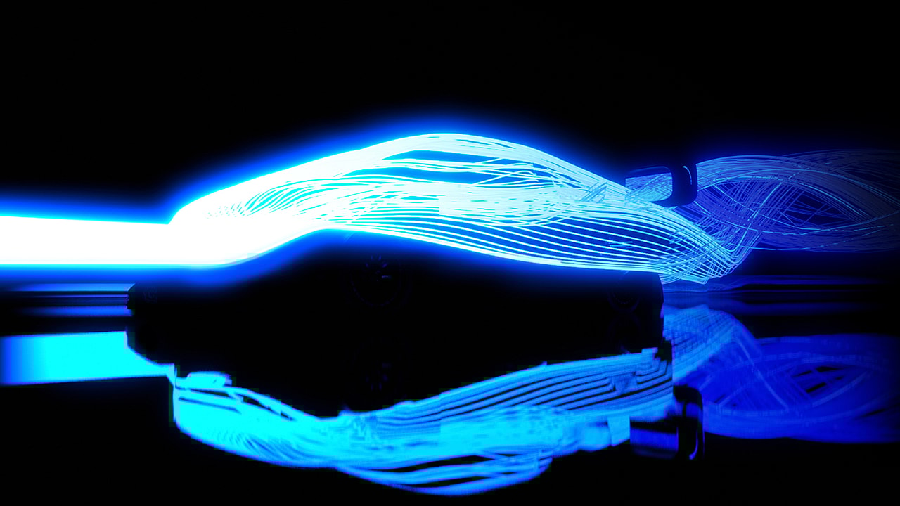 A glimpse inside the rear of the truck shows it to have what appears to be either an elaborate bundle of power cables or a cooling system for its rear electric motor. Another image shows off its aerodynamically tapered body.